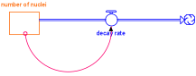 II.1.2 Lumped variable function-based models A second kind of function-based model ignores the spatial distribution of the variables of interest.[21] The underlying mathematics is that of coupled first order differential equations converted into the appropriately corresponding difference equations in order to allow for numerical computation. A particularly interesting environment for the writing of such models is called STELLA. It permits users to state relationships among variables and their rates of change graphically. Once the model is thus partially defined in terms of the qualitative relationships among the variables, the user is prompted to supply those quantitative values that are needed by the model in order to compute the time evolution of the system. Here, for example, is a STELLA model of radioactive decay. The essential variable is the number_of_undecayed_nuclei.