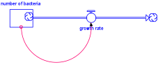 The qualitative relationship in the model was defined by establishing a variable called number_of_nuclei (in the diagram), and its rate of change whose magnitude is controlled by a quantity called decay_rate. The size of the decay_rate is related to the number_nuclei. Then once the initial number of nuclei is specified the model may be evolved in time. It should be pointed out that all phenomena that decay exponentially can be reasonably modeled in this fashion. Moreover, all phenomena that grow exponentially can also be modeled in this fashion simply by changing the sign of the decay_rate, thus turning it into a growth rate. Here for example is a model of the exponential growth of a colony of bacteria: