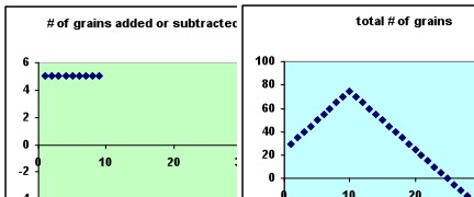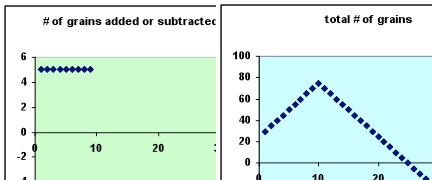 The total number of grains as a function of the number of days now looks very much like a quadratic function. Is it really a quadratic function and how can we tell? A quadratic function has the following property – if you evaluate a quadratic function at uniformly spaced points in its domain, the values of the function for adjacent points will differ by an amount that changes linearly. This is exactly how we calculated the number of grains to add each day in this case. Finally, let’s consider what kind of rule leads to the third family of functions widely used in early algebra – the absolute value function. Absolute value functions are made up of two sections each of which is linear but the two linear sections have slopes that can be written as m and – m. We have seen that the change = constant rule leads to a total number of grains function that is linear. Suppose we use amend that rule in this way – let the change from the start to some particular later day be say 5 grains/day and after that particular day –5 grains/day. Here is a spreadsheet of that rule.