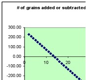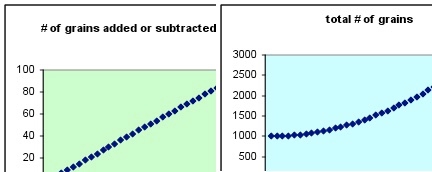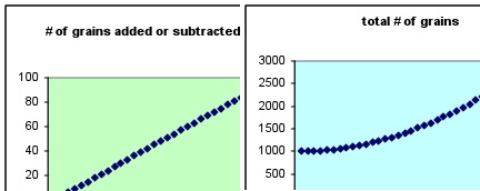 If the same change is made each day, as in this case, then the total number of grains as a function of time will be a linear function of the number of days. By choosing the starting number you can control the vertical intercept. If you add a constant amount each day the total number of grains as a function of time will be a linear function with positive slope. If you subtract a constant number each day the total number of grains as a function of time will be a linear function with negative slope. A linear function has the property that if you evaluate a linear function at uniformly spaced points in its domain, the values of the function for adjacent points will differ by a constant value. This is exactly how we calculated the number of grains to add each day in this case. Suppose we choose a somewhat more complicated rule – suppose that each day we add a number of grains that is proportional to the number of days that have elapsed since the beginning of the procedure. For example, we might start with 100 grains on day 0 and then add 3 grains on day 1, 6 grains on day 2, 9 grains on day 3, etc. Here is a spreadsheet that shows what happens when we do that.
