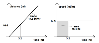 c. multiplication and division of adjectival quantitiesThe (I E E') Semantic Triad Fortunately, we are not obliged to rely on “repeated addition” and “sharing” to provide our students with mental models of multiplication and division. It is possible to approach the problem of providing students with a mental model of the multiplication and division of adjectival quantity that is not limiting in the ways we discussed above. In the interests of specificity let us consider the previous problem involving the three related quantities E' {(46.4, mi), distance traveled} E {(3.2, hr), time trip takes} I {(14.5, mi/hr), average speed on trip} These three quantities can be related to one another via multiplication operations or via division operations. However, because of the commutativity of multiplication, there is only one distinct multiplication operation relating the three quantities, i.e. I x E = E' while there are two division operations relating the three quantities, i.e. E'/ E = I and E'/ I = E The intensive quantity can be thought of explicitly as a relationship between distance and time for an infinite ensemble of trips, each of which is traversed at an average speed of 14.5 mi/hr. The correspondence between distance and time for this ensemble of trips can be illustrated in a graph such as the one we showed earlier. In the distance-time plane, a line of slope 14.5 mi/hr is drawn through the origin. Every point on the line describes a trip in the ensemble of trips described by the intensive quantity 14.5 mi/hr. The triad of quantities are linked to one another semantically and students would be well served if they were taught to think of a referent situation involving distance, time and speed. The relationship among these quantities can be expressed in three different ways.[7] There is another graphical encoding of the relationship among these quantities that can easily be constructed. In the velocity-time plane a horizontal line whose ordinate is 14.5 mi/hr is drawn. Every point on this line corresponds to a trip of a given duration. Each such point also defines an area bounded by the average velocity axis, the average velocity, the time axis and the value of the time of the trip in question. The measure of this area is the distance traveled in the course of that trip. Here then are the two graphical representations of this (I E E') triad presented side by side. ![]() It is interesting to note that these two graphical representations of the relationship among the three quantities of interest capture the essential idea of the differential calculus that the rate of change of a function is given by its slope, and the essential idea of the integral calculus that the cumulative area under the graph of a function is a measure of cumulative effect of the changes in the function. These ideas can be introduced quite early in the curriculum to help think about and represent the semantically related triad of adjectival quantities involved in multiplication and division. When in later years, students in learning calculus are asked to think about slopes and areas under curves, they will be extending the power of some familiar ideas. There do not seem to be important differences between the behavior of discrete and continuous adjectival quantity under the referent-transforming operations of multiplication and division. All of the following cases are to be found D/D x D e.g. children / family x families D/C x C e.g. people / hour x hours C/D x D e.g. pounds / person x number of people C/C x C e.g. miles / gallon x gallons Before leaving our discussion of the (I E E') triad, it is worth addressing an issue that seems to cause a great deal of difficulty for many people, i.e. the division operation E' / E = I when both extensive quantities are discrete adjectival quantities. An example is {100, children} / {40, families} = {(2.5, children/family), average number of children per household} Note that although both children and families are count nouns and that {100, children} and {40, families} are discrete adjectival quantities the quantity {(2.5, children/family), average number of children per household} is a continuous adjectival quantity. Many people find this quantity moderately amusing, seemingly because they think it refers in some way to a portion of a child.[8] d. the conversion of unitsThe (I E E') semantic triad allows us to return to an issue that we left unresolved earlier, i.e., the conversion of units. Consider the quantity {(13.5, ft), length of bookshelf}. Another way to describe the same attribute of the same bookshelf is to use a different measure. Suppose we wish to measure the length of the bookshelf in yards rather than feet. The quantity {(3.0, ft/yd), length conversion factor} has the property that when used in a multiplication or a division, it does not change the nature of the referent but only the numerical description of its measure. Unit measure conversion factors are thus special sorts of intensive quantities that can be used freely in order to achieve consistency of measures.[9] One can now return to the question of how to compare or find the sum and/or difference of the two volumes {(2, ft3), volume} and {(144, in3), volume} Using suitable unit measure conversion factors allows us to say that {(2, ft3), volume} and {(3456, in3), volume} are equivalent volumes as are {(144, in3), volume} and {(0.0833, ft3), volume}. While it is straightforward enough to make comparisons of magnitude of the two volumes expressed in common units, the question of what sense is there in forming their sum and/or difference remains exactly as it was before - the arithmetic operations of addition and subtraction may not be reasonable models of the referent situation. e. do we need scalars?There is another intensive quantity that merits special attention. This kind of intensive quantity is like the unit measure conversion factor in that it does not change the nature of the referent of the qu
