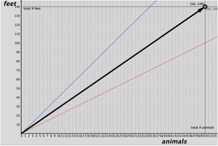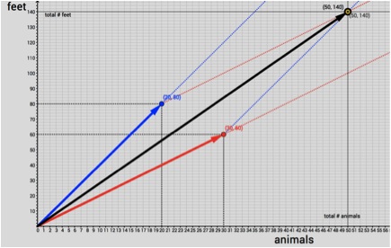 When the black vector is [50 animals, 140 feet], then... ...the thick blue vector drawn from the origin to the point {20 animals, 80 feet} has a horizontal component of 20 animals and a vertical component of 80 feet. ...the thick red vector drawn from the origin to the point {30 animals, 60 feet} has a horizontal component of 30 animals and a vertical component of 60 feet. ...the thick black vector drawn from the origin to the point {50 animals, 140 feet} is the vector sum of the red and blue vectors. It may be thought of as representing a population of 50 animals, each of which has 2.8 feet!!
