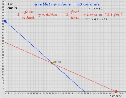 Every point in the {hen, rabbit} plane with non-negative integer coordinates represents some number of hens and some number of rabbits. Every point with integer coordinates on the blue line represents some mixture of hens and rabbits totaling 50 animals. Every point with integer coordinates on the red line represents some mixture of hens and rabbits that have a total of 140 feet. The point where the lines intersect is the point that represents that mixture of 50 animals that has 140 feet. It is important to point out that unless one first solves this problem symbolically, the “graphical target”, i.e. the point of intersection of the two plotted functions is not known in advance of the plotting of the functions. This illustration is drawn from the applet Hens & Rabbits I in the “Modeling