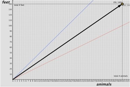 The solution to the problem which is represented by an integer lattice point in the {hens, rabbits} plane is represented differently in the {animals, feet} plane. In this plane there is a “rabbit vector” [with components animals and feet] which lies along the light blue line and a “hen vector” [with components animals and feet] which lies along the light red line. When the blue rabbit vector is of the proper length [20 animals, 80 feet] and the red hen vector is the proper length [30 animals, 60 feet], the black vector is the “sum” of the “rabbit vector” and the “hen vector” and goes from the point {0 animals, 0 feet} to the point {50 animals, 140 feet} – which, of necessity, must be an integer lattice point in the {animals, feet} plane that lies somewhere between or on the red and blue lines.