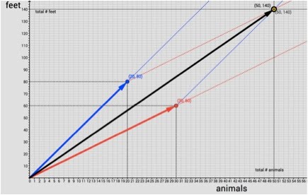 Having set the “graphical target” at the outset, one can now ask what linear combination of a red vector (hens) and a blue vector (rabbits) will yield the black vector. Moving the blue and red points along their respective lines is now a simple exercise in vector addition that leads to the solution (as pictured). The reader will note that in this method of graphical solution in the {animals, feet} plane it is possible to solve for each of the variables separately.